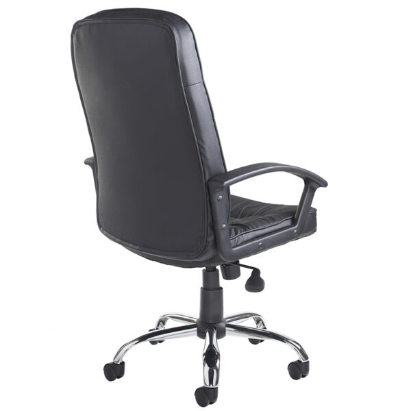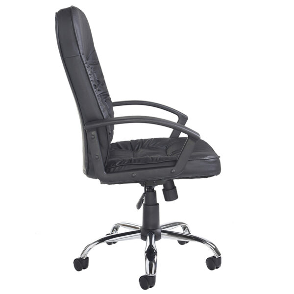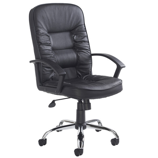 The Hertford High Back Managers Chair in black leather-faced upholstery offers a refined blend of plush comfort and executive styling. Its ruched stitching detail adds a touch of sophistication, while the deep padded seat and back provide pronounced lumbar support for long hours of seated work. Designed with fixed black arms and a chrome five-star base, it glides smoothly on twin-wheel hooded castors—ideal for hard surfaces like hardwood floors. With gas height adjustment and a weight capacity of 115kg, Hertford is a versatile choice for managerial, executive, or guest seating environments.