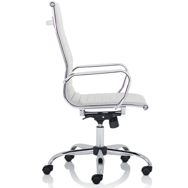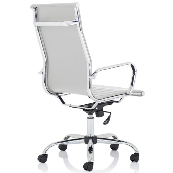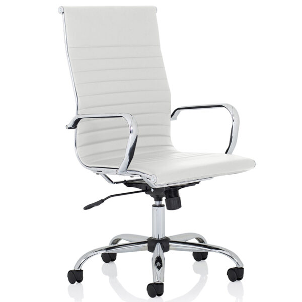 The Nola chair blends Italian-inspired style with comfort and value, ideal for modern offices or home workspaces. Available in black or striking white bonded leather, it features soft-touch upholstery, chrome accents, and detailed stitching. Executive models offer tilt-and-lock functionality, while the cantilever version includes floor protectors and a sprung chrome frame.