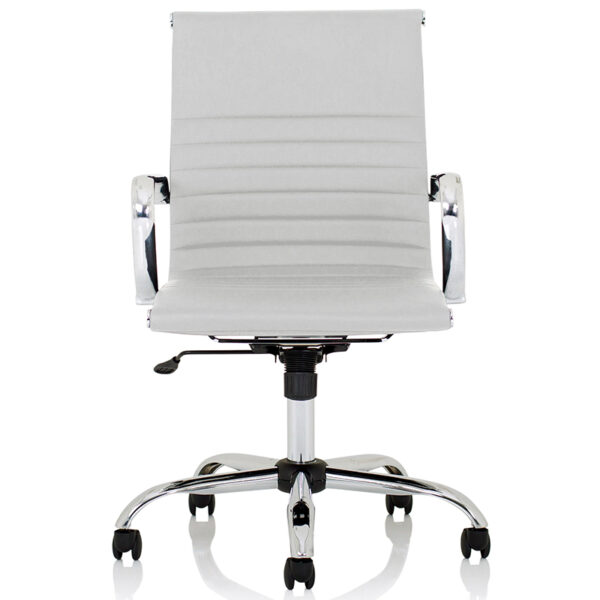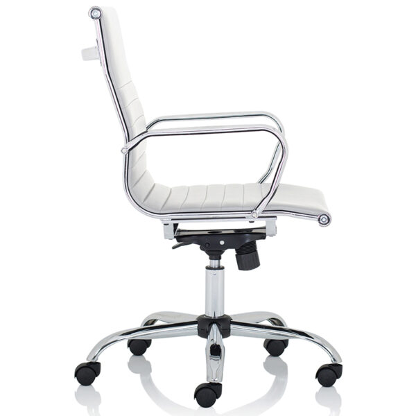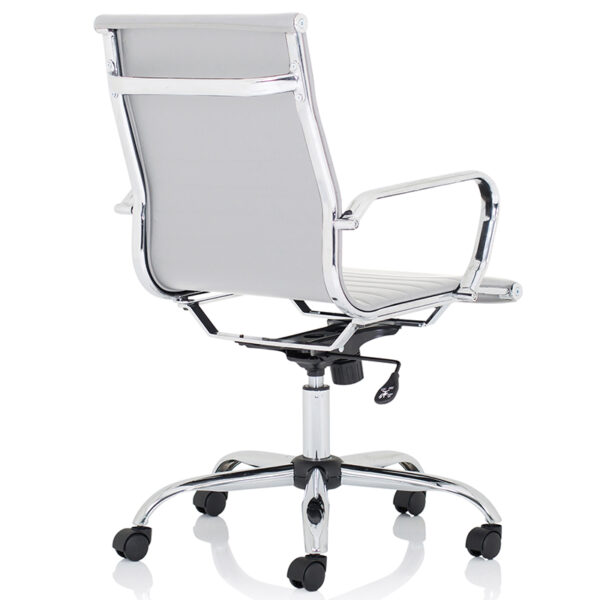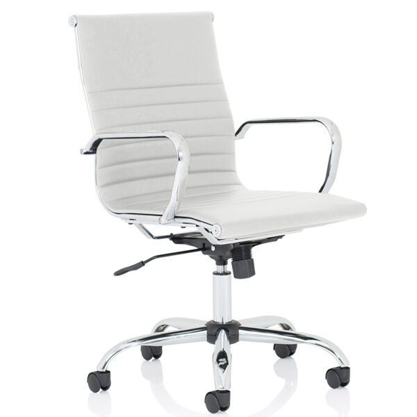 The Nola chair blends Italian-inspired style with comfort and value, ideal for modern offices or home workspaces. Available in black or striking white bonded leather, it features soft-touch upholstery, chrome accents, and detailed stitching. Executive models offer tilt-and-lock functionality, while the cantilever version includes floor protectors and a sprung chrome frame.