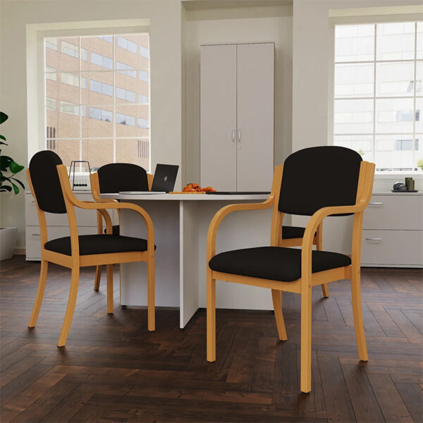 Crafted with a warm beech wood frame, the Madrid Visitor Chair offers generous comfort and timeless style. Its padded seat and backrest provide lasting support, while the integrated wooden armrests enhance both function and form. Available in black or blue fabric, this versatile chair suits a wide range of settings—from reception areas to meeting rooms—with ease and elegance.