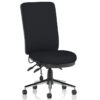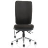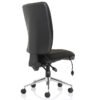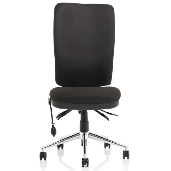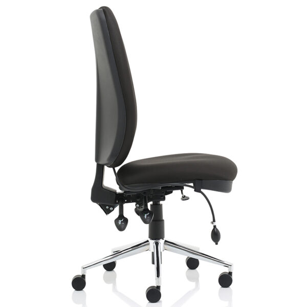 The Chiro High Back Fabric Operators Chair is built for 24-hour use and includes a height-adjustable ratchet backrest with pump-up lumbar support, contoured foam cushioning, a triple lever mechanism for independent seat and backrest tilt, a seat slide function, and a polished chrome five-star base