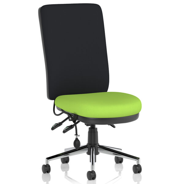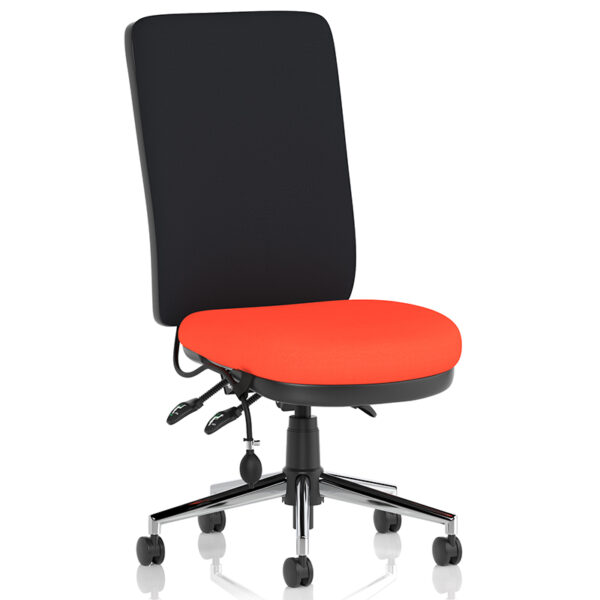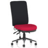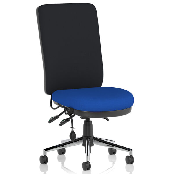 The Chiro High Back Fabric Operators Chair is built for 24-hour use and includes a height-adjustable ratchet backrest with pump-up lumbar support, contoured foam cushioning, a triple lever mechanism for independent seat and backrest tilt, a seat slide function, and a polished chrome five-star base