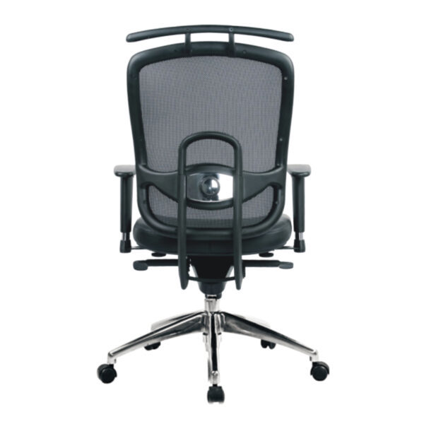 This high back executive office chair features a uniquely integrated coat hanger, complete with an integrated rear back design for added style and stylish adjustable ‘t’ shaped padded arms. It also offers a generously proportioned posture curved leather effect upholstered seat with pronounced waterfall front, a stylish contoured black nylon detailed mesh back with adjustable lumbar support, a substantial reclining knee tilt mechanism with tension control – adjustable for individual bodyweight and lockable in the upright position and a large aluminium spider base fitted with twin wheel hooded castors.