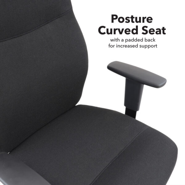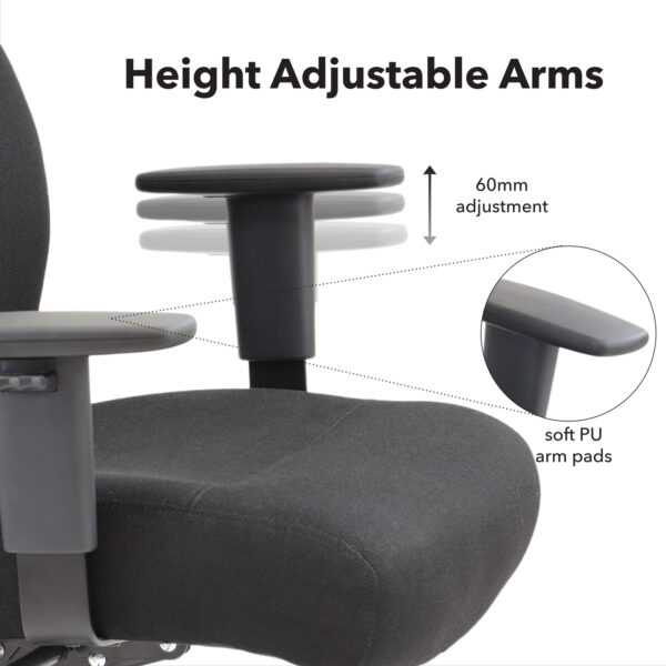 Our Porter Bariatric Operator Chair boasts a generous seat with a waterfall front design, providing exceptional comfort for long hours. The posture-curved seat and contoured backrest are complemented by a solid, stylish nylon frame. Height-adjustable arms offer 60mm of adjustment, topped with plush PU arm pads for added support.