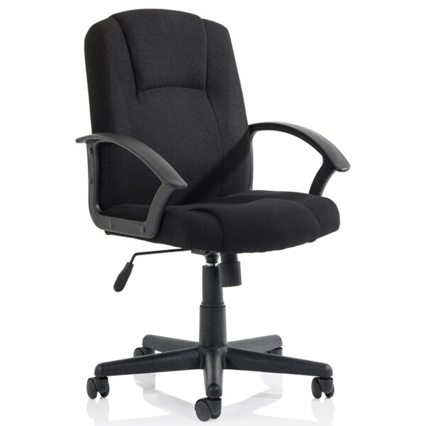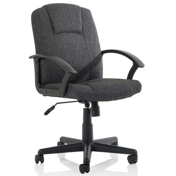 The Bella Managers Chair in black, blue and charcoal fabric blends classic styling with everyday comfort. Its contoured fabric panels shape the backrest and seat for a tailored fit, while the defined lumbar curve and sculpted shoulder support offer ergonomic reinforcement throughout the workday. A built-in tilt mechanism with one-touch tension adjustment allows for personalized recline and lock settings. Finished with strong, textured PU armrests and fabric contact upholstery, this budget-friendly executive chair delivers a polished look with practical features.