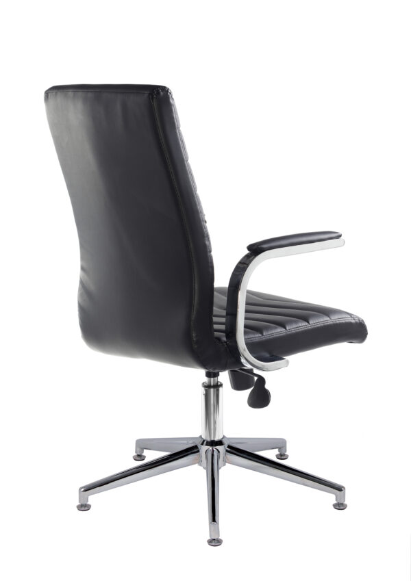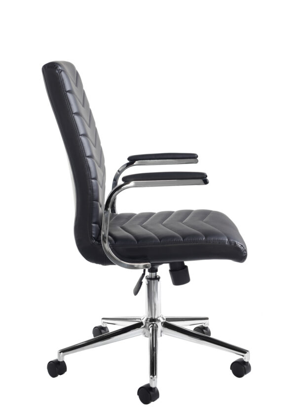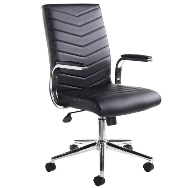 The Martinez High Back Managers Chair offers exceptional comfort and functionality with its curved, diagonally patterned back, available in two chic options – a sophisticated grey fabric or a sleek black faux leather. The panel stitching detail highlights the design, while the padded chrome arms with matching upholstered arm pads provide additional comfort and style.