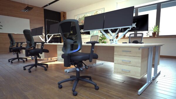 Portland III is a robust, multi-functional task chair built for demanding contract environments. It features a breathable airmesh seat, ratchet-adjustable backrest, lumbar support, seat slide, and a triple lever mechanism for independent seat and back angle control. Available with a black or white mesh back and weight tension adjustment, it blends ergonomic precision with durable performance.