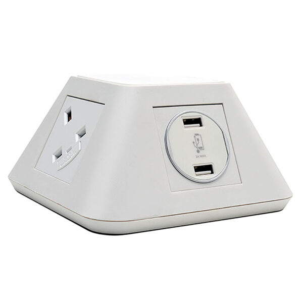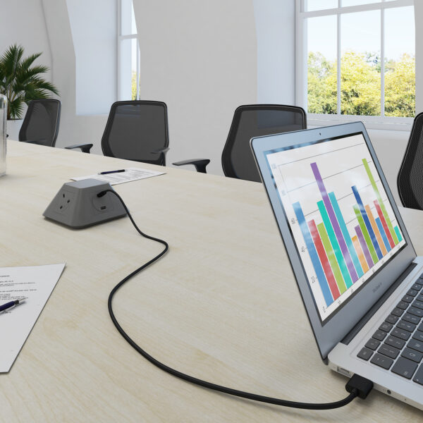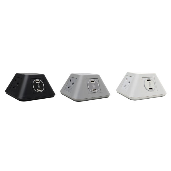 The Inca on-surface power module features 2 UK sockets and 2 twin USB fast charge ports, designed specifically for communal areas and meeting rooms. Available in black, grey, and white, this stylish module offers four accessible faces to meet diverse power and data needs in any workspace. Inca can be placed on any tabletop, used free-standing, or fitted into a grommet hole, allowing users to conveniently power and charge laptops, mobile phones, and tablets simultaneously while personalizing their workspace.