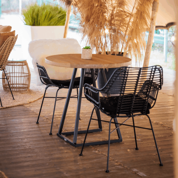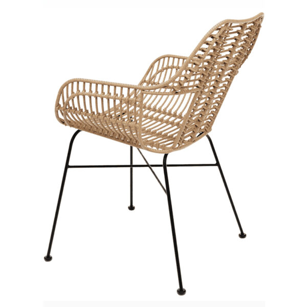 The Malia Stackable Outdoor Woven Arm Chair offers a perfect blend of style, comfort, and durability, making it ideal for both indoor and outdoor use. The chair features a high-quality steel frame with a sleek matte black powder coating, ensuring long-lasting strength and a modern appearance. Additionally, the feet are protected with plastic caps to prevent scratches and damage to floors.