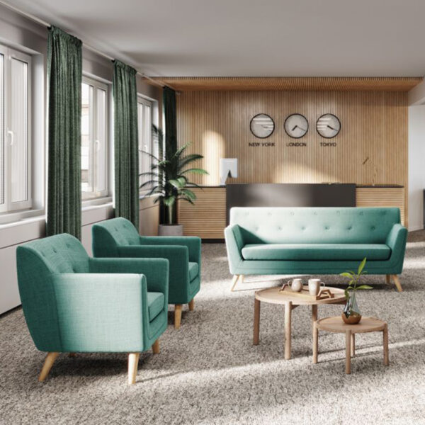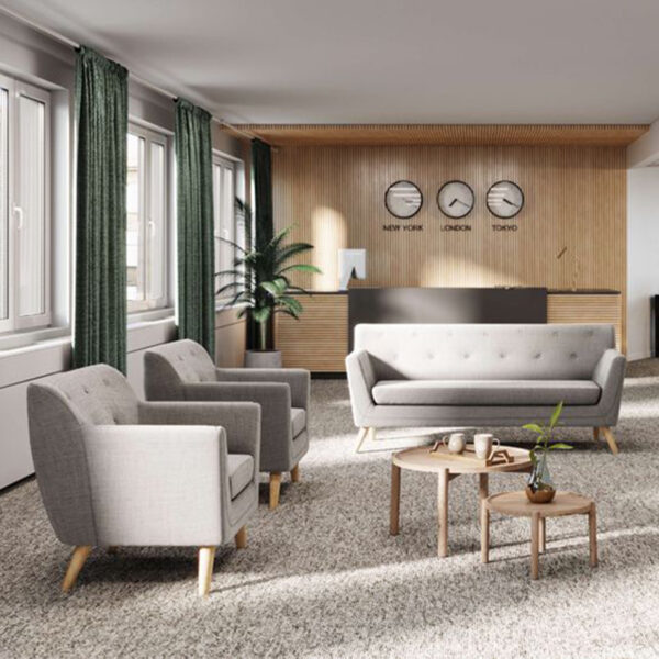 The Skandi armchair combines style and practicality, providing spacious seating ideal for reception and communal areas. Available in two upholstered fabric options, it ensures long-lasting quality and comfort.Its sleek, minimalist design effortlessly complements a range of interior styles, while the classic button-back detailing adds a timeless touch of elegance. The smart wooden legs enhance its sophisticated appeal, making it a perfect addition to any room. Complete the look with the matching three-seater and two-seater for a cohesive, stylish seating arrangement.
