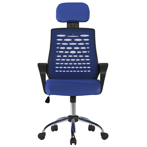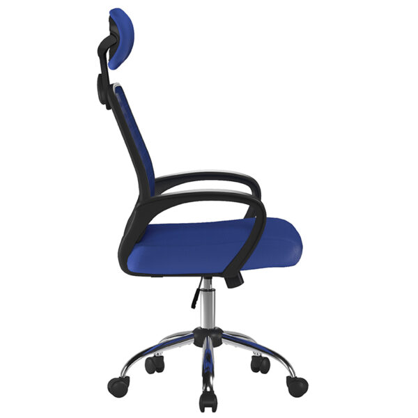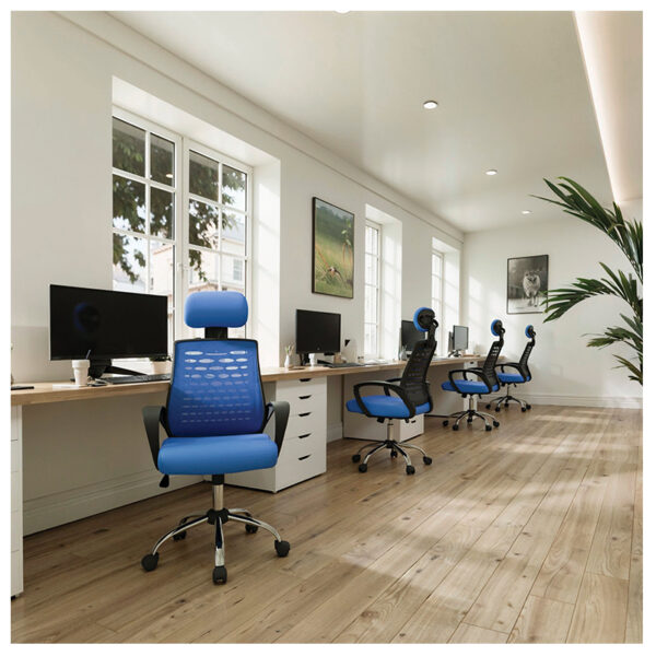 The AeroFlex High Back Mesh Chair delivers ergonomic comfort and durability for long workdays. With a high back, adjustable mesh headrest, and fixed arms, it supports posture and neck alignment. Its chrome base and PU casters offer smooth mobility, while the 130kg capacity and 10-hour use rating ensure reliability. Available in black, blue, and grey, it features height adjustability to suit any workspace.