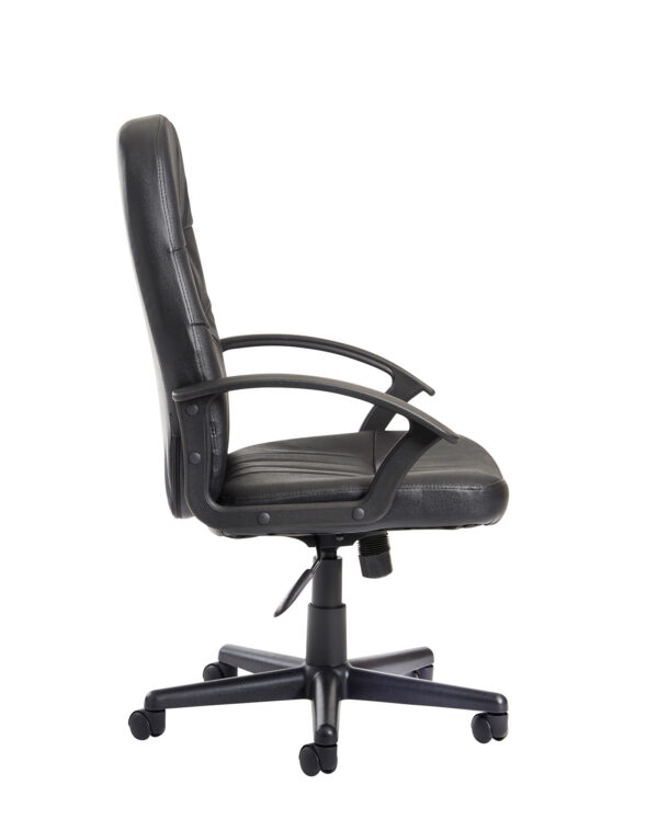 The Cavalier manager seating range is available as a soft, supple leather faced chair or as a fabric chair in blue or charcoal, both carefully stitched and tufted for plush comfort and a most elegant look. Designed to complement the managers chair, the black leather Cavalier visitors chair will also make a stunning addition to any conference room or waiting area.