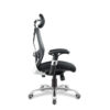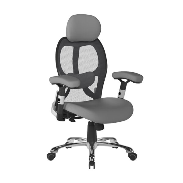 Our high back mesh task operator armchair with adjustable headrest & chrome base offers a generously proportioned posture curved upholstered seat with waterfall front and contoured black nylon detailed mesh backrest with adjustable lumbar support, a synchronous mechanism for simultaneous adjustment of seat and backrest adjustable to suit the user’s bodyweight (tension control) and stylish adjustable T-section padded arms.