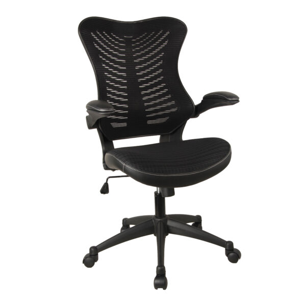 The Mercury 2 Executive Medium Back Mesh Chair combines contemporary design with ergonomic comfort. This popular chair features a fully reclining tilt mechanism that can be locked in the upright position and adjusted to suit individual body weight through tension control. Its posture-contoured mesh back and AIRFLOW mesh seat promote breathability and support, while the waterfall seat front enhances comfort during extended use. Folding arms, padded for extra comfort, add versatility and convenience. The chair is finished with a stylish black shell and a solid, matching five-star base, making it a sleek addition to any workspace. Available in blue, red, and black mesh, the Mercury 2 offers both style and functionality for any professional setting.
