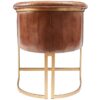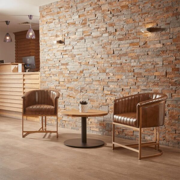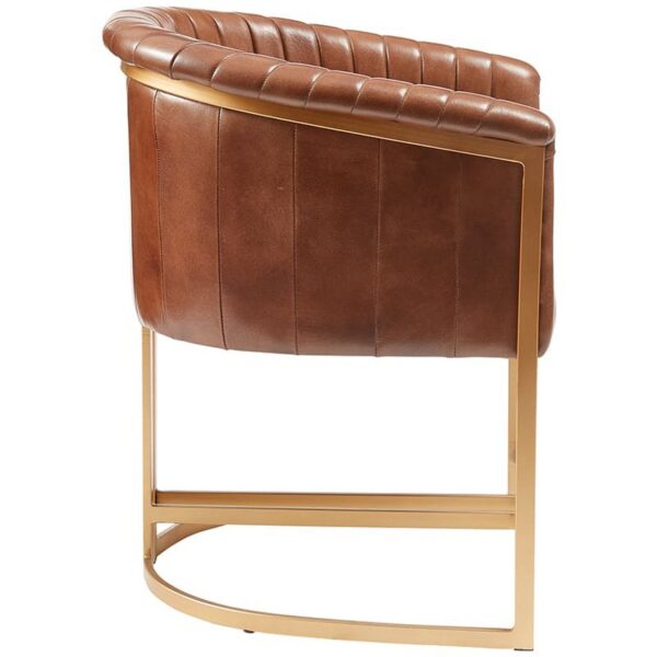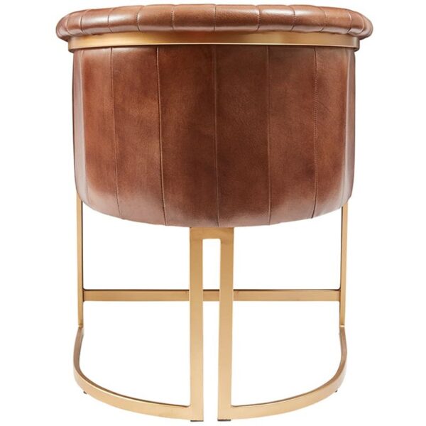 The Mayfair armchair is perfect for luxury living. Whether you’re outfitting a restaurant with chic seating or creating a cozy nook in your home, this tasteful chair will bring high-end charm to any setting. The strong metal frame is painted in striking gold and provides a stable foundation enhanced by fitted floor protectors. Cushioned with genuine pecan brown leather, the fluted back rest and seat give extreme comfort while enhancing the overall look of this exquisite piece. Tested for contract use and rated highly for hospitality, hotels and workspace – the selection of sleek colors make it an excellent choice to satisfy any palette. As versatile as it is beautiful, every detail of this Mayfair arm chair exudes a sense of sumptuous elegance so you can relax and unwind in display of opulence.