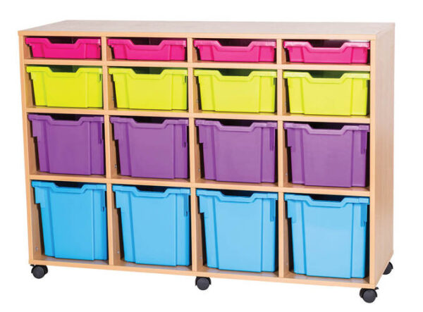 This 16 tray combination unit is a high quality, UK manufactured unit. This Unit includes 16 Gratnells trays, consisting of 4 Shallow Tray, 4 deep trays and 4 extra deep trays and 4 Jumbo Trays that are available in a range of colours
