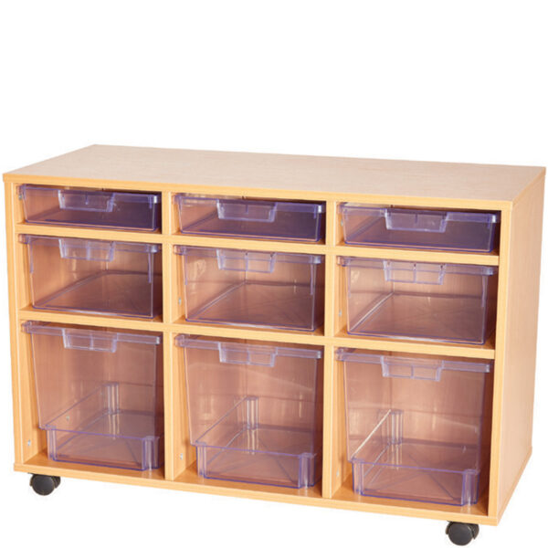 These tray units are fitted with the Glide & Tilt Runner System, which holds trays in an angled position, allowing easy & safe access to the tray contents. All units include Certwood crystal clear trays that are moulded in Super tuff shatter-proof High-Impact Polystyrene (HIPS). Units are fully mobile with locking castors. Supplied in a Beech finish.