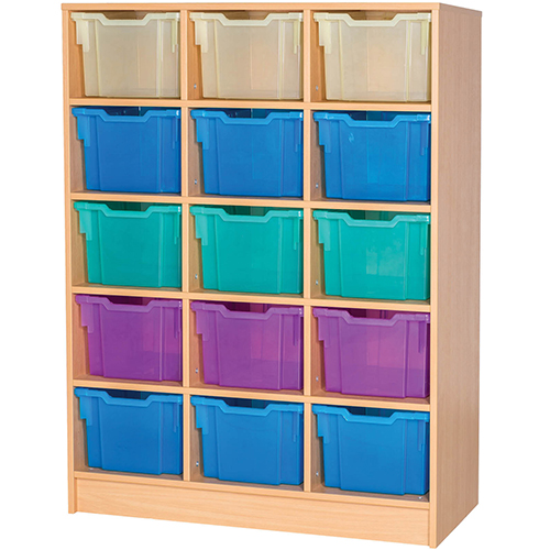 This 15 Tray triple bay unit is a high quality, UK manufactured unit. This Unit includes 15 Extra Deep Gratnells trays that are available in a range of colours with fixed shelves. Â Ideal for schools, colleges and any classroom environment.