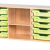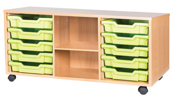 10 Tray Mobile Triple Bay Classroom Storage Unit With Centre Shelf – 533mm High