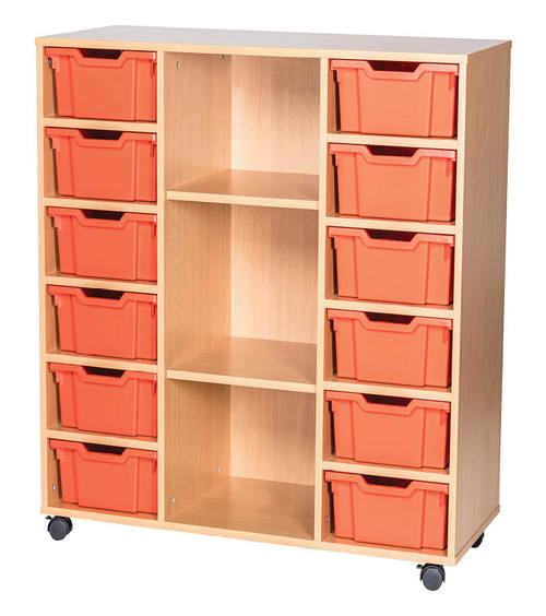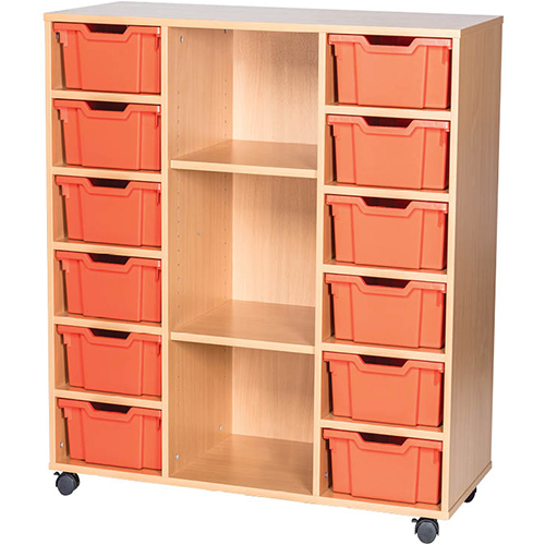 12 Deep Tray Mobile or Static Triple Bay Classroom Storage Unit with Centre Shelves – 1189mm High