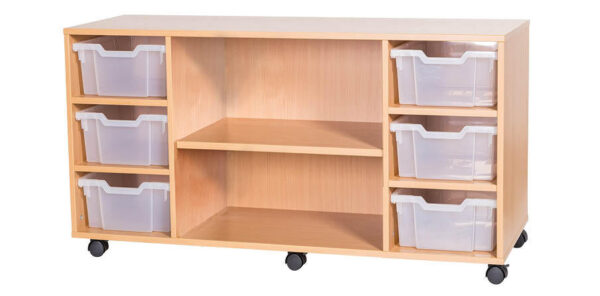 6 Deep Tray Mobile or Static Quad Bay Classroom Storage Unit With Centre Shelf – 615mm High