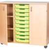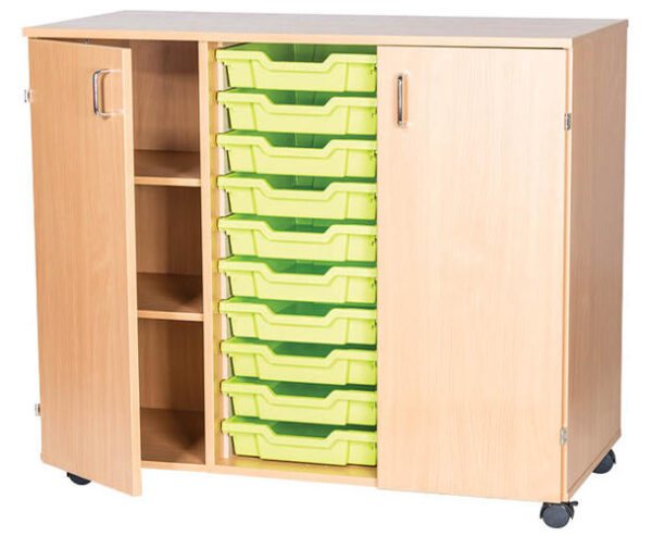 This 10 Tray Triple bay Cupboard unit is a high quality, UK manufactured unit. This Unit includes 10 Gratnells trays that are available in a range of colours and 2 cupboards with shelves.